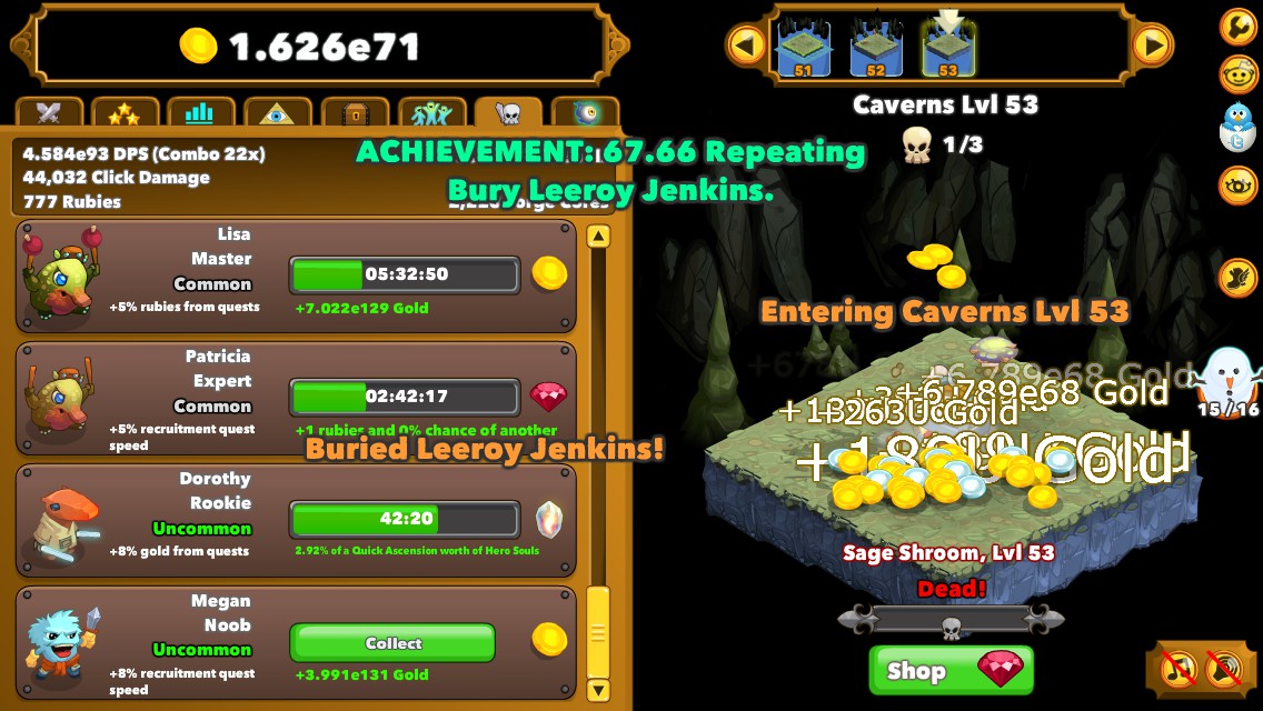Clicker Heroes #300 - Can It Be? LEEROY JENKINS! - YouTube Thanks for watching! Hope you enjoyed!Show some love and subscribe!Leave a comment! All feedback is appriciated!------Discord: -----... Leeroy Jenkins achievement... :: Clicker Heroes General Discussions I'm thinking it's more Leeroy Jenkins is a merc who dies on it's first quest. That makes more sense to me, keeping in spirit of the history behind Leeroy Jenkins. Having it literally be named Leeroy Jenkins would be silly. #2 Ajid Lovett Dec 16, 2015 @ 2:20am you can find merc name in CH Wiki .. There are 8 tiers of Merc .. Common (+/-)5% 67.66 Repeating achievement in Clicker Heroes - TrueSteamAchievements How to unlock the 67.66 Repeating achievement in Clicker Heroes: Bury Leeroy Jenkins. TrueSteamAchievements. Gaming. News. Steam News Community News Site News Site Updates Suggest News. Gaming. Steam Games Steam Game Series Steam Achievements Popular Achievements Guideless Achievements Steam Walkthroughs Game Reviews Achievement Solutions. Leeroy Jenkins : ClickerHeroes Leeroy Jenkins is the rarest merc, but you should get him fairly soon if you cycle through your mercs a lot. Put down 100 mercs, and you should have gotten him by then. 4 level 2 · 5 yr. ago