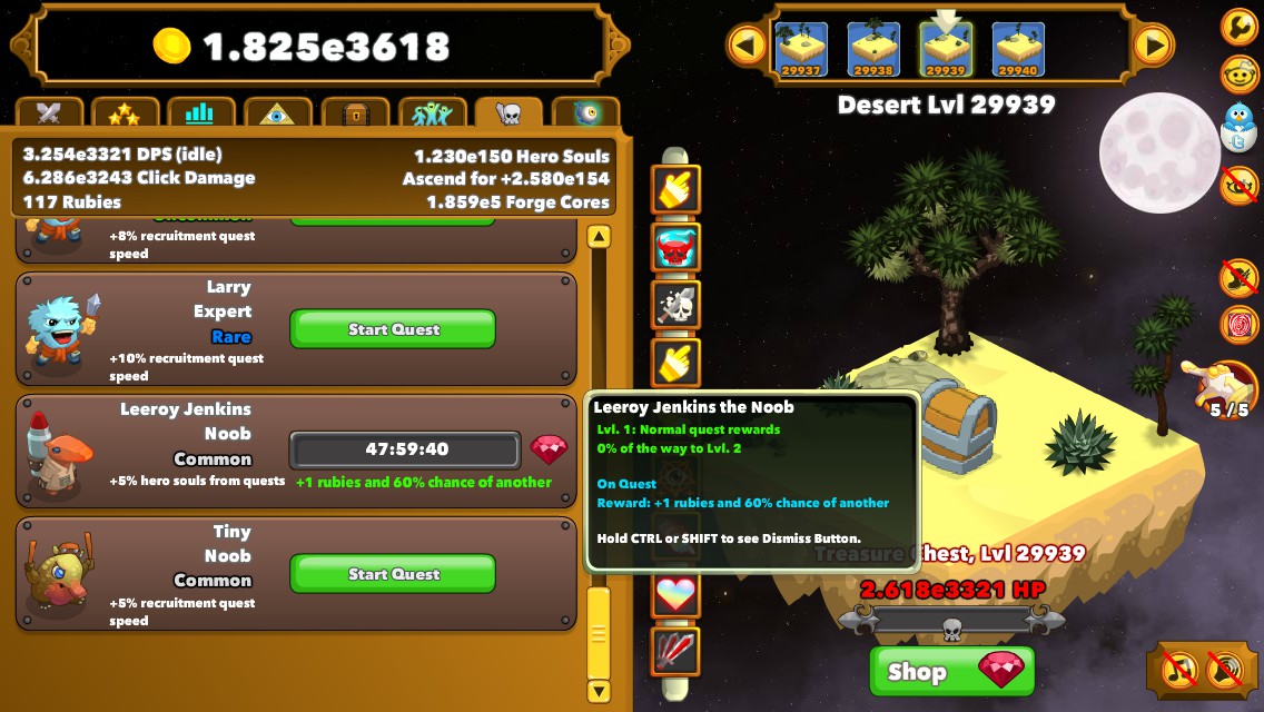 Steam Community :: Guide :: How to acquire the Leeroy Jenkins ... You can do this by right clicking the Chrome icon or simply use the short command CTRL+SHIFT+N 2. Now go to clickerheroes official website [ ] 3. Start the game by pressing Play 4. Go to the options by clicking the wrench icon 5. Click save and then close the options menu. The save is now copied to the clipboard. 6.