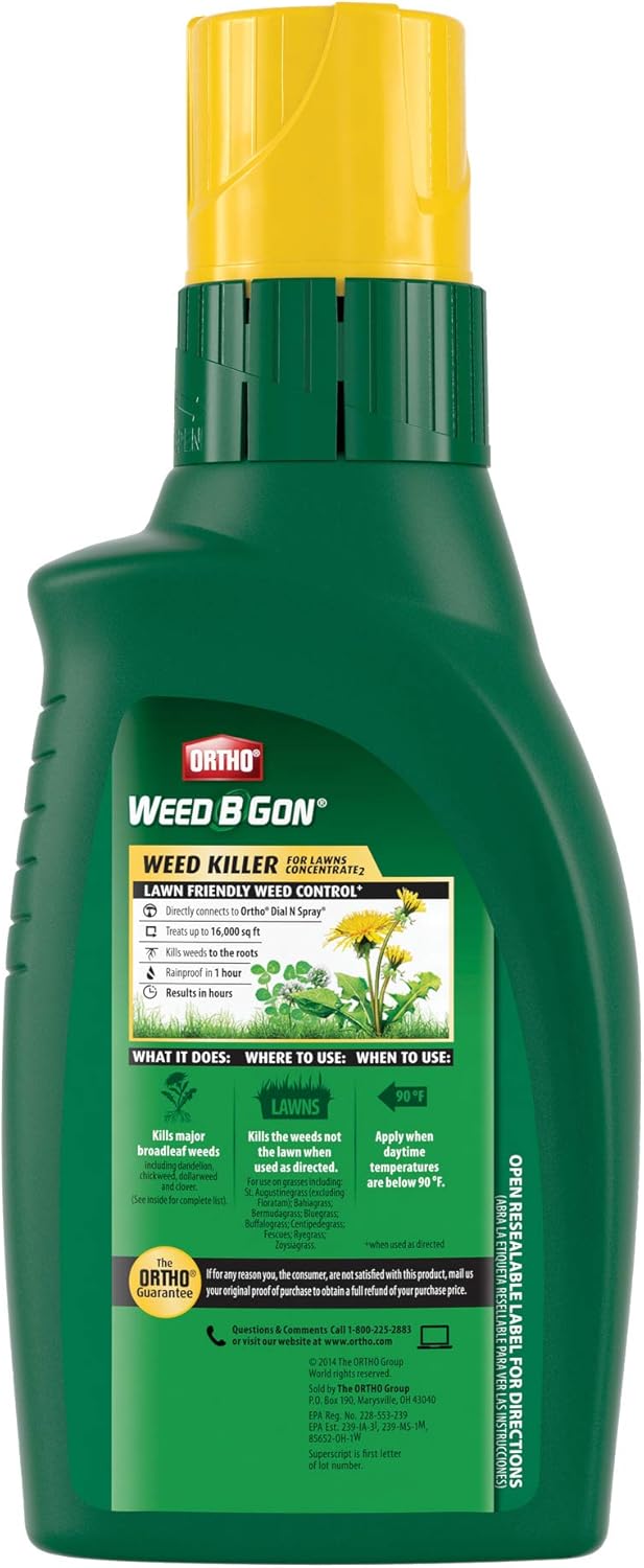 Ortho Weed B Gon 1 Gal. Weed Killer for Lawns Concentrate2 0430005 Ortho Weed B Gon Weed Killer for Lawns Concentrate2 is guaranteed to kill weeds to the root. When used as directed, you can kill over 250 plus weeds without damaging your lawn. Ortho Weed B Gon is specially designed for Northern and Southern lawns and may be applied with the Ortho Dial 'N Spray Hose-End Sprayer or any other tank sprayer.