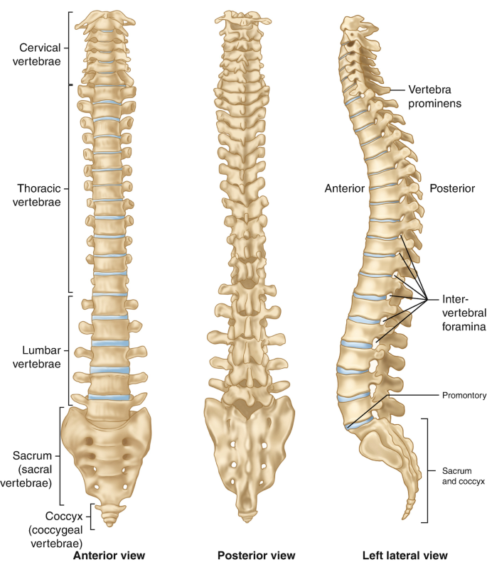 Bones of spine: Anatomy of Vertebral Column - BYJUS The bones of the spine are named according to the regions, e.g. cervical vertebrae are named as C1, C2, C3, etc. Thoracic as T1, T2, etc. Lumbar as L1, L2, and so on. Cervical- 7 vertebrae (C1 to C7)- The first vertebra, C1 or Atlas articulates with the two occipital condyles of the skull. It allows the maximum movement of the neck.