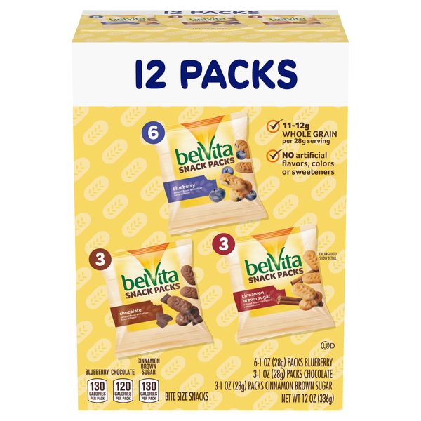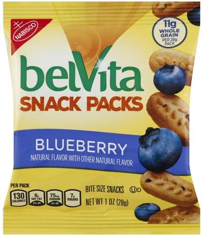 Nabisco Belvita Blueberry Breakfast Biscuits - Shop Snacks & Candy at H-E-B Each 50g serving is packed with 18g of delicious whole grain, 3g of fiber, and is fortified with minerals and B vitamins. belVita contains no high-fructose corn syrup, no partially hydrogenated oils, and no artificial flavors or sweeteners. Preparation instructions To open, slide finger under flap and loosen gently.