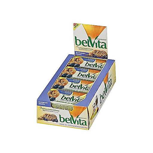 belVita Blueberry Breakfast Biscuits, 5 Packs (4 Biscuits Per Pack ... Lightly sweet and crunchy, belVita Blueberry Breakfast Biscuits are made with wholesome ingredients. These blueberry biscuits are specially baked to release up to 4 hours of nutritious steady energy. These breakfast cookies are also made with 18 grams of whole grain per 50-gram serving.