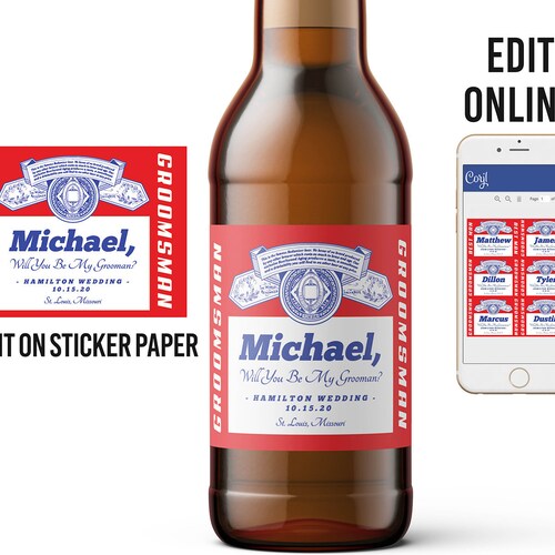 Printable Groomsman Beer Label Template Editable Printable | Etsy GROOMSMAN/BEST MAN BEER LABEL TEMPLATE • 4 x 3 Label - Saves as PDF with 6 on 8.5x11 • Instructions • Customer Support - I'm here to help! ***Please note, these beer labels will not be waterproof. Most home printers don't have the capability to print on waterproof paper.