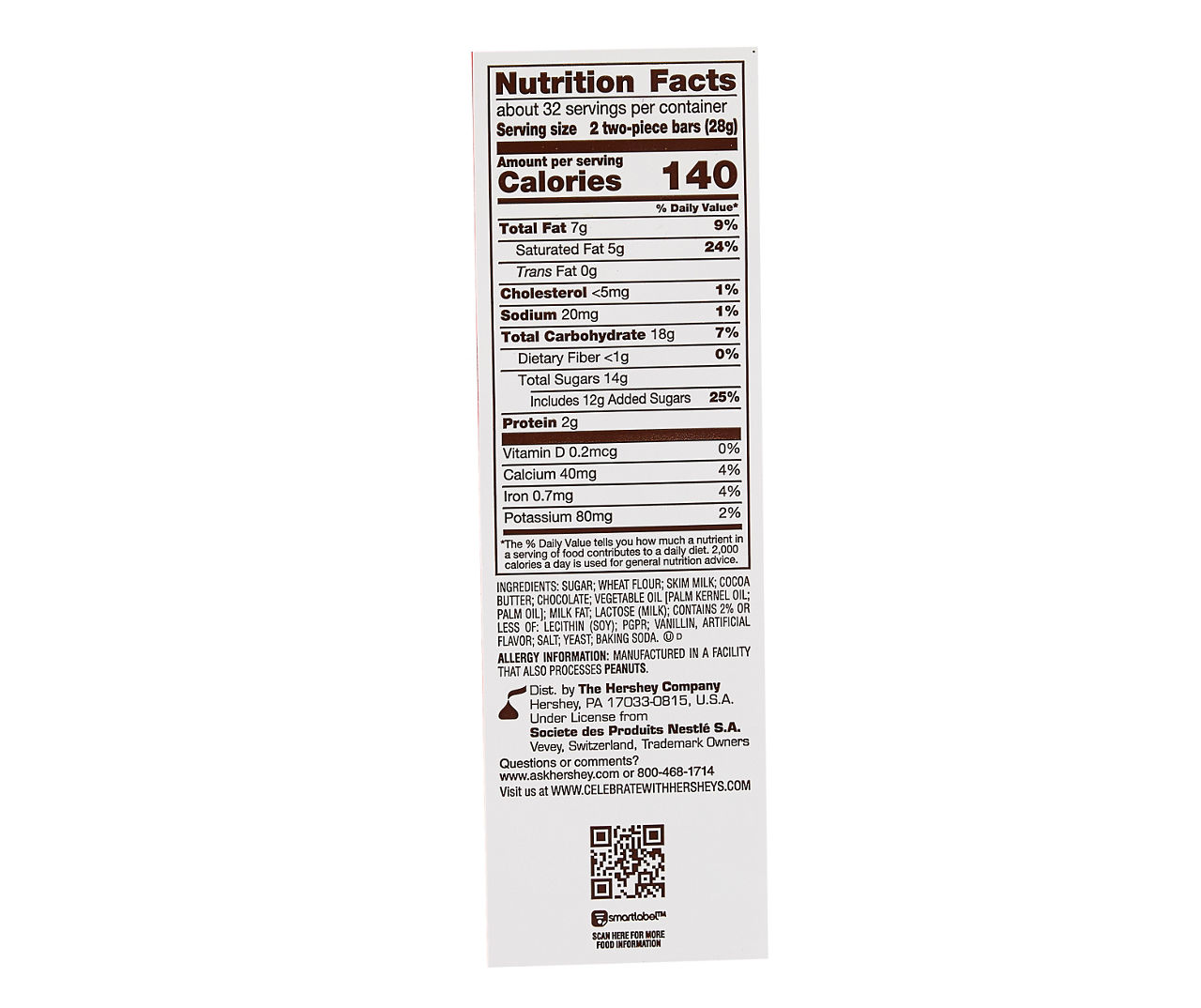 KIT KAT® Milk Chocolate Candy Bars, 1.5 oz, 6 pack - Hersheyland KIT KAT® Kosher Nutrition Information Nutrition Facts Servings Per Container 6 Serving size 1 package Amount per serving Calories 210 % Daily Value* Total Fat 11g % Saturated Fat 7g % Trans Fat 0g Cholesterol 5mg % Sodium 30mg % Total Carbohydrates 27g % Dietary Fiber 1g % Total Sugars 22g Includes 19g Added Sugar % Protein 3g Vitamin D 0.4mcg %