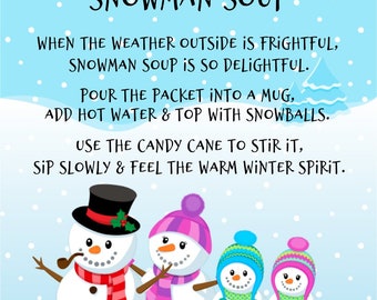 Snowman Soup: Recipe For Warming Winter Gift | Organized Christmas Add a printable gift tag or bag topper, or attach hand-written tag using the Snowman Soup poem below. Snowman Soup Was told you've been real good this year. Always glad to hear it! With freezing weather drawing near, You'll need to warm the spirit. So here's a little Snowman Soup Complete with stirring stick. Add hot water, sip it slow.