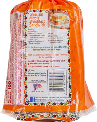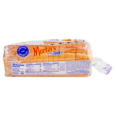 Potato Bread - Martin's Famous Potato Rolls and Bread Once you've tried the golden taste of Martin's Potato Bread, you'll understand why no other bread will do! Nutrition Ingredients Serving Size - 1 Slice (32g/1.1oz) | 16 servings per container 90 Calories 15g Carbs 3g Protein Amount Per Serving %DV* Total Fat 1.5g 2% Saturated Fat 0g 0% Trans Fat 0g n/a Cholesterol 0mg 0% Sodium 105mg 5%