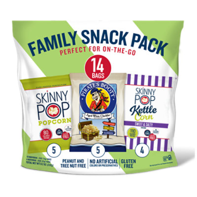 SkinnyPop & Pirate's Booty Variety Case, 24ct, 0.5oz Individual Sized ... Pirate's Booty Aged White Cheddar Cheese Puffs, 60ct, 0.5oz Individual Snack Size Bags, Gluten Free, Healthy Kids Snacks, 100 Calorie Snack Packs 640 17 offers from $26.25 From the brand Shop Popped Popcorn Visit the Store Shop Microwave Popcorn Visit the Store Shop Mini Cakes Visit the Store From the manufacturer Product Description