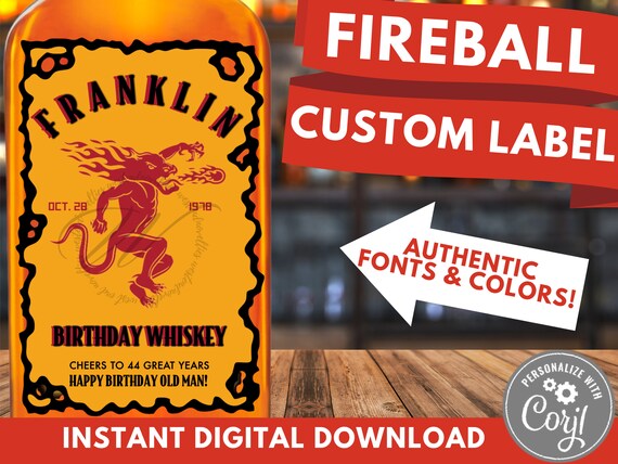 Fireball Custom - Etsy Personalized Whiskey Label Birthday Sticker Fireball Whisky Gift Idea Groomsmen Bridesmaid Whiskey Gift Label CreationzByBenz (2) $8.99 Custom Cinnamon Whiskey Label, Personalized Whiskey Label, Birthday Whiskey gift, Groomsmen Whiskey, Printable Whiskey Label, Whiskey Gift SweetNSimpleCards (89) $4.33 More colors