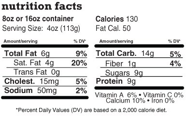 Nutrition Facts for Noosa Raspberry Yogurt • MyFoodDiary® Noosa Raspberry Yogurt. Nutrition Facts. Serving Size. 4-oz container. Amount Per Serving. 130. Calories % Daily Value* 8%. Total Fat 5g. 18% Saturated Fat 3.5g Trans Fat 0g. 7%. Cholesterol 20mg. 3%. Sodium 60mg. 5%. Total Carbohydrate 16g. 0%. Dietary Fiber 0g