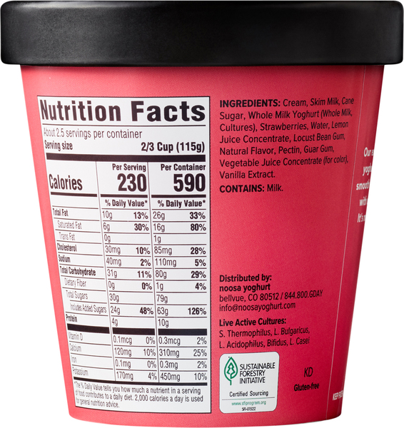 Noosa Finest Yogurt, Raspberry: calories, nutrition analysis & more ... Nutrition Serving Size: 1 container (113g) Amount per Serving My Daily Value Total Fat 5 g 8% Saturated Fat 3.5 g 21% Trans Fat 0 g 0% Cholesterol 20 mg 7% Sodium 60 mg 3% Potassium 250 mg 5% Total Carbohydrate 15 g 6% Dietary Fiber 0 g 0% Sugars 15 g 21% Added Sugars 8 g 33% Protein 5 g 10% Calcium 190 mg 19% Iron 0.1 mg 1% Vitamin D 0 mcg 0%